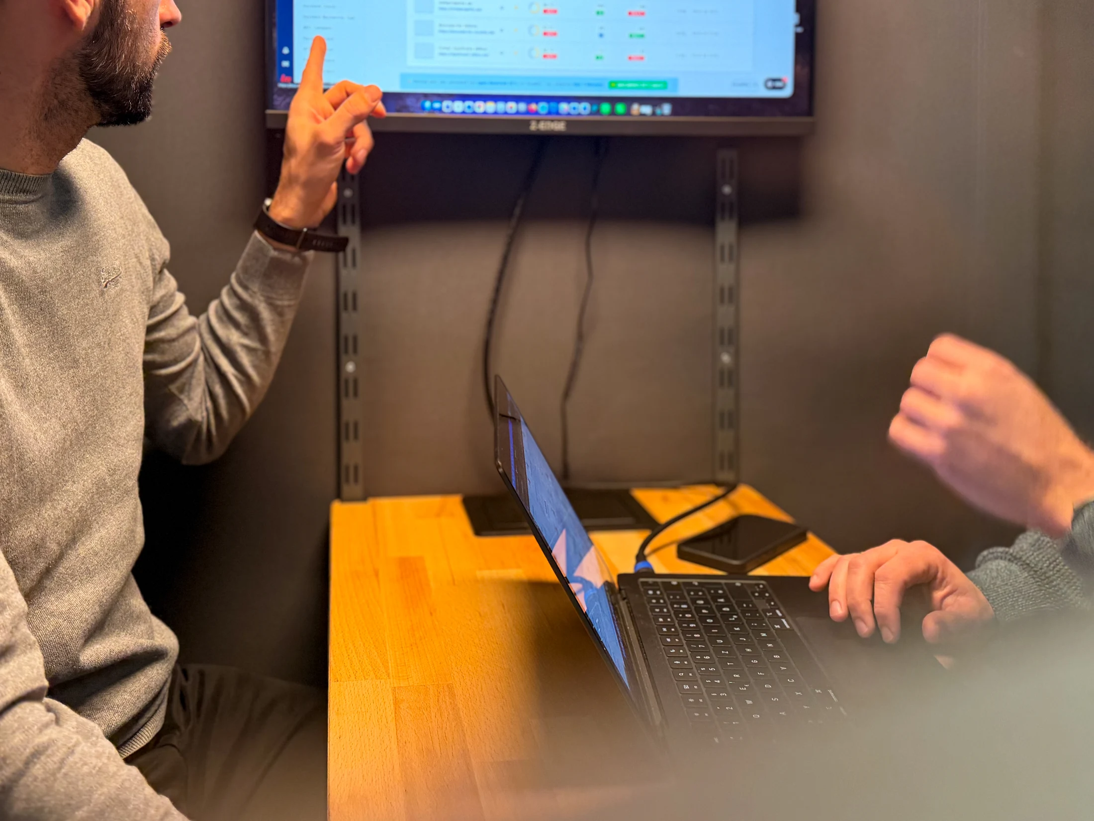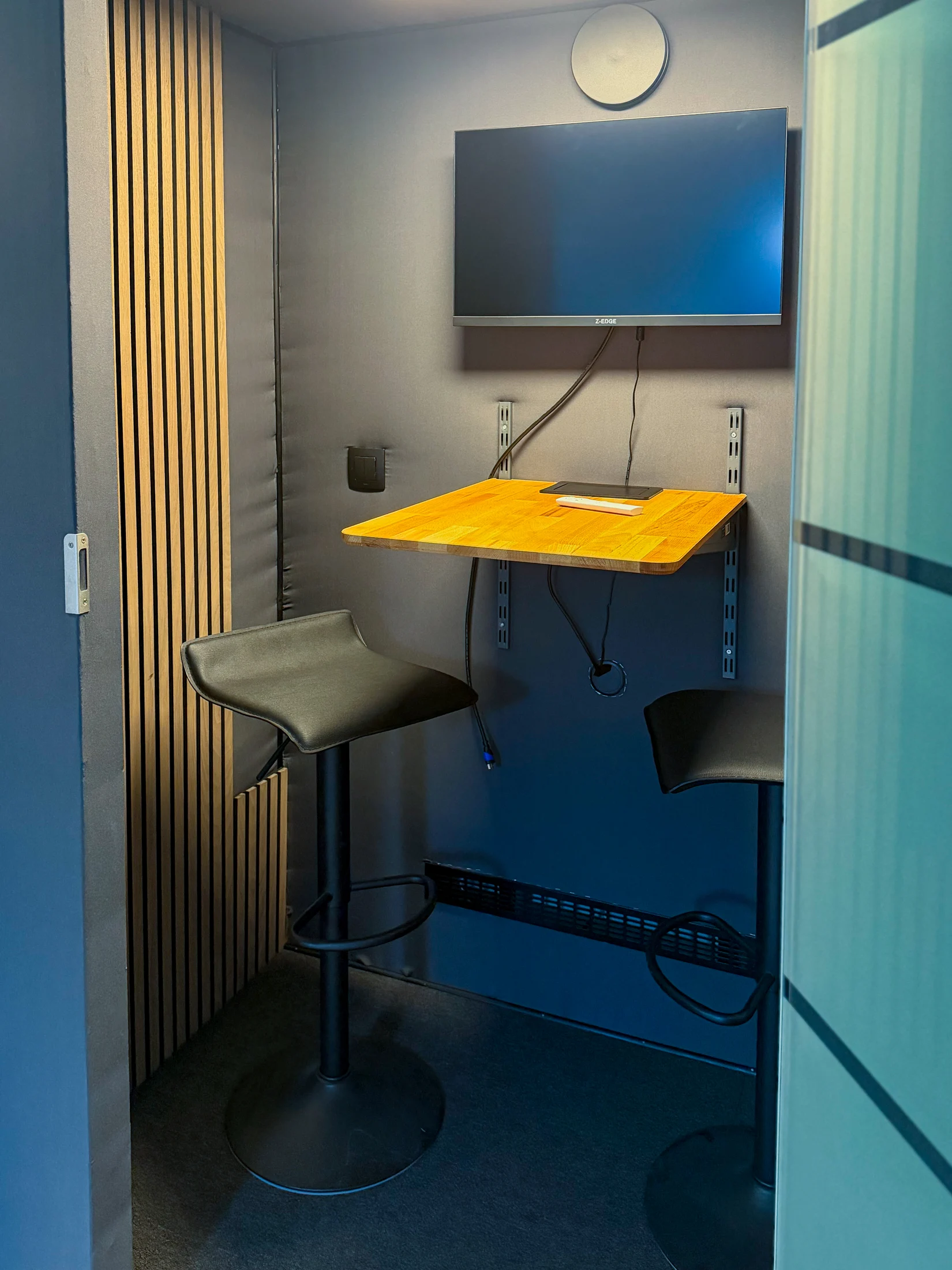 Arbeitsplätze mit Monitor, ergonomischem Bürostuhl und passenden Adapterkabeln für dein Gerät.